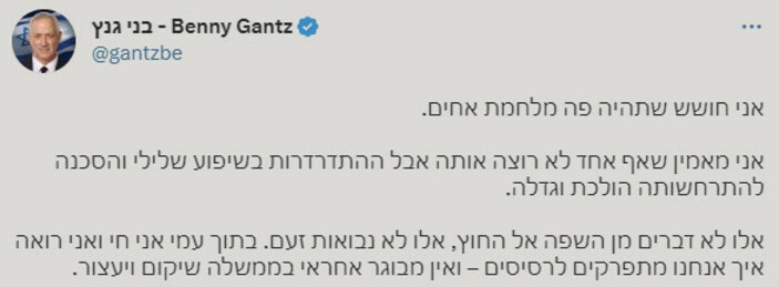 Sosyal medya hesabından açıklama yapan Gantz, İsrail’de kimsenin iç savaşı istemeyeceğini lakin gidişatın makûs olduğunu vurguladı: