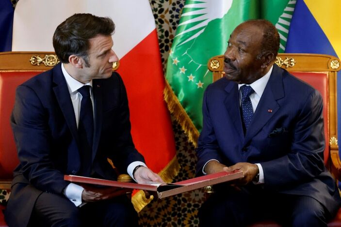 Fransız önder, başşehir Libreville’deki havalimanında Gabon Cumhurbaşkanı Ali Bongo Ondimba tarafından karşılandı.