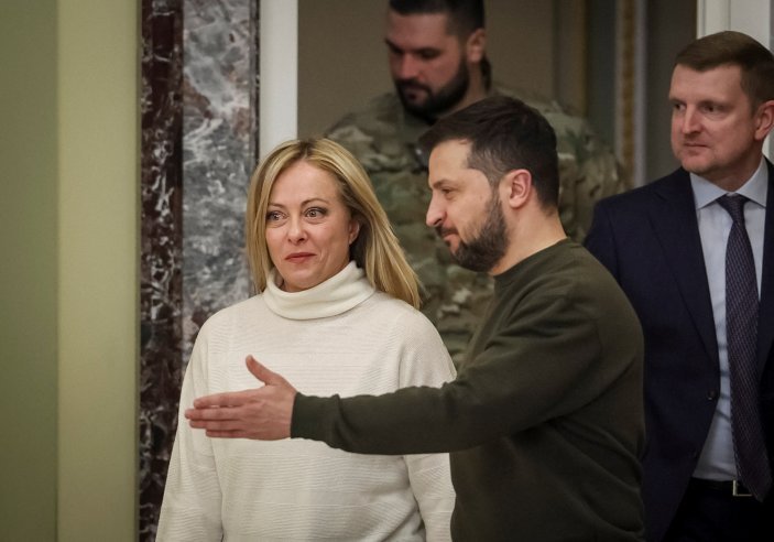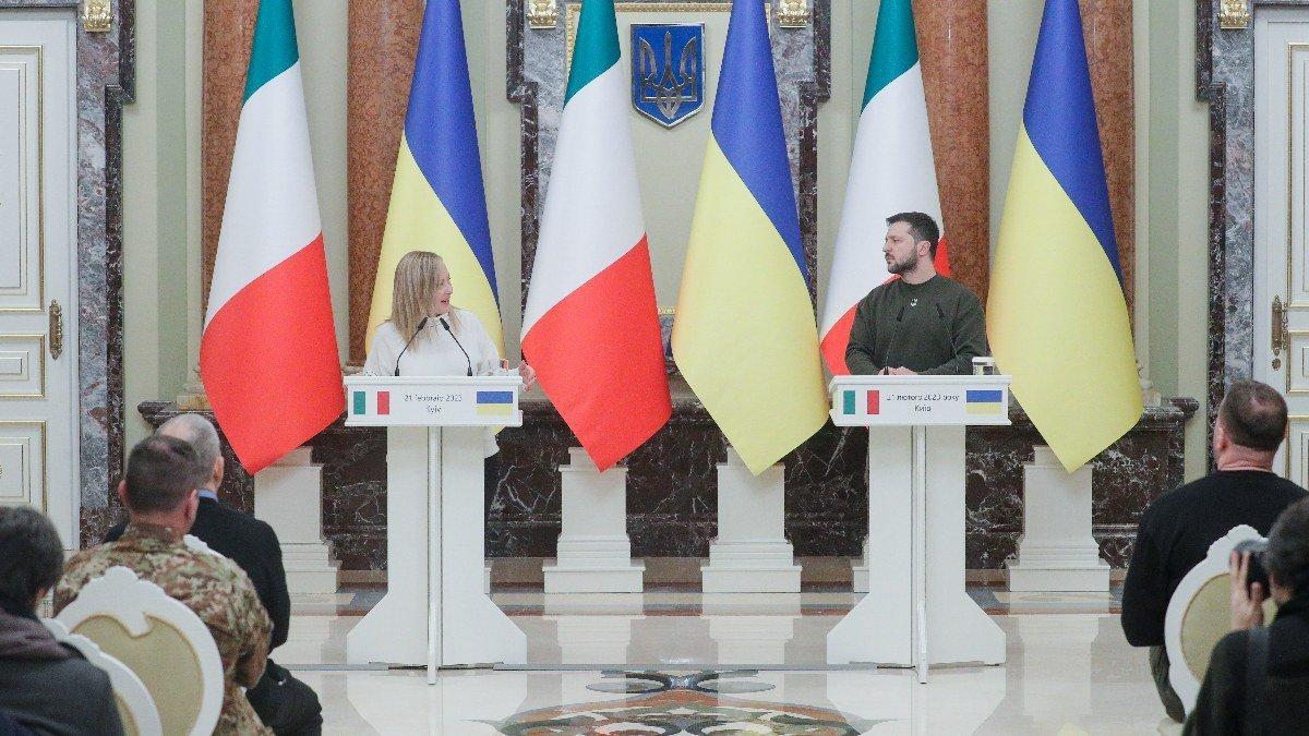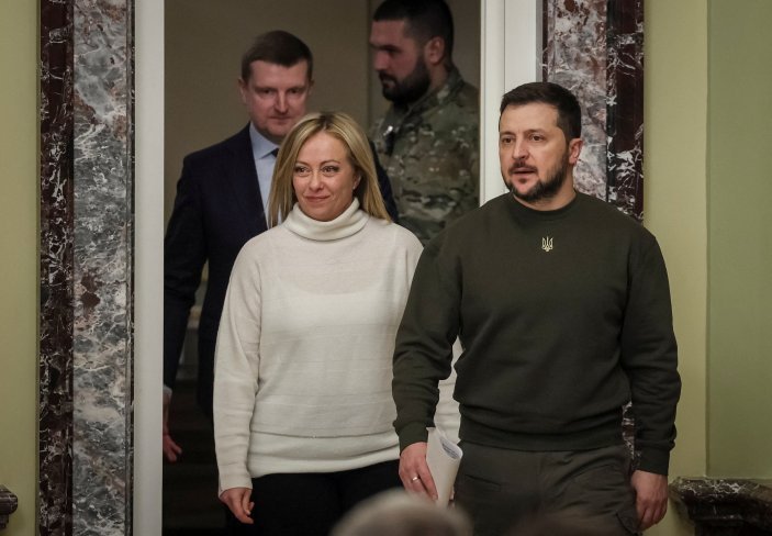 İtalya Başbakanı Giorgia Meloni, Ukrayna’nın başşehri Kiev’de Ukrayna Devlet Lideri Vladimir Zelenskiy ile görüşmesinin akabinde Zelenskiy ile ortak basın toplantısı düzenledi.