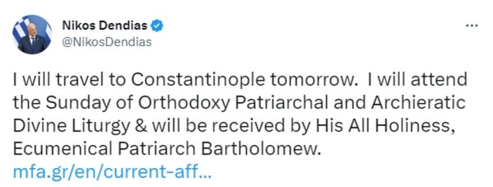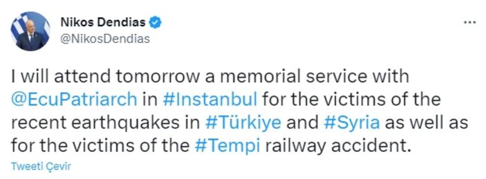 “Yarın Türkiye ve Suriye’deki son zelzelelerin kurbanları ve Tempi demiryolu kazası kurbanları için İstanbul ‘da, @EcuPatriarch anma merasimine katılacağım.”