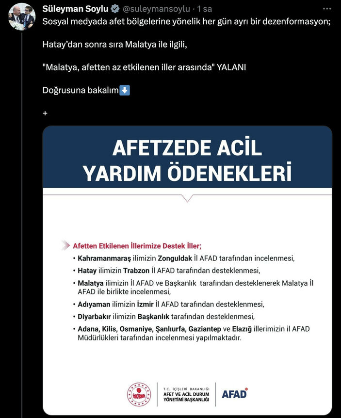 Sosyal medyada afet bölgelerine yönelik her gün farklı bir dezenformasyon. Hatay’dan sonra sıra Malatya ile ilgili, ‘Malatya afetten az etkilenen vilayetler arasında’ palavrası. Birinci gün vilayetlerin eşleşmesi için yapılan, akabinde çabucak değiştirilen görseli günler sonra alıp tahrike soyunanlara söylenecek kelam çok fakat vakti değil. Malatyalı hemşerilerimiz bu palavralara prestij etmesinler. Buyruklarına amadeyiz. Yaralarımızı birlik içinde sarmaya devam edeceğiz.